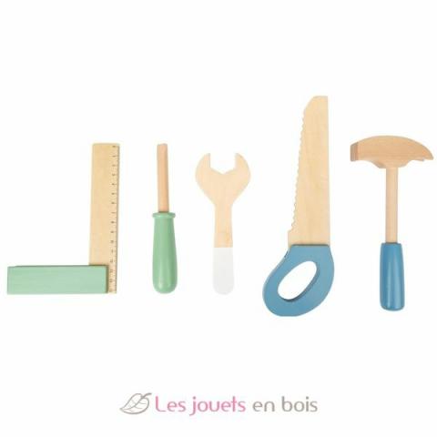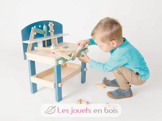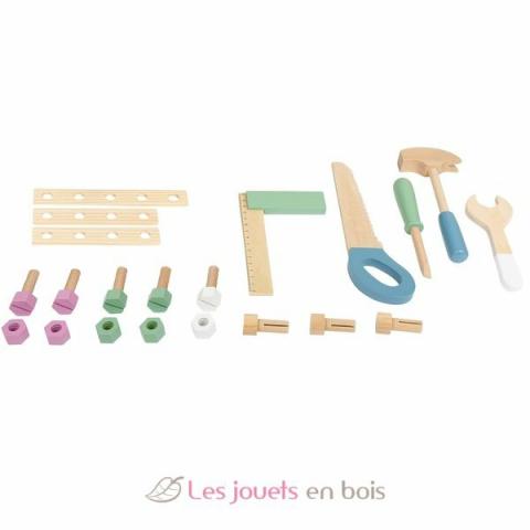 Kompaktes Heimwerken im skandinavischen Stil! Mit dieser Werkbank aus Holz kann auf kleiner Spielfläche handwerkliches Geschick erprobt werden. Durch Drehen, Sägen und Schrauben werden feinmotorische Fähigkeiten geschult. Sanfte Farben, klare Formen und das schlichte nordische Design sprechen Mädchen und Jungs gleichermaßen an. Inkl. 21-teiligem Zubehör bestehend aus 5 Schrauben, 5 Muttern, 3 Nägeln, 3 Lochleisten und 5 Werkzeugen. Hier können die kleinen Handwerker schon beim Aufbau unterstützen und sich über das Ergebnis freuen. Ein kompaktes Rollenspielzeug fürs Kinderzimmer! Passt durch das schlichte Design zu jeder Wohnungseinrichtung.